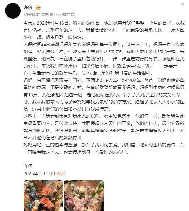 儿子发文澄清1月13日,何晴冥诞之际,儿子许何发布长文悼念母亲。