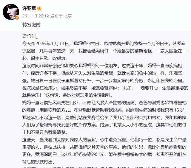 时间飞快,直到2026年1月13日,何晴去世已经整整一个月了,许亚军才终于表态,让一切尘埃落定。